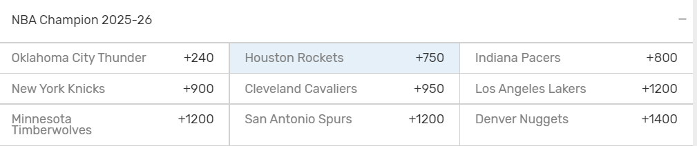 在这笔重磅交易完成前,火箭下赛季的夺冠赔率是+1400,只位列第七,排在雷霆、步行者、尼克斯、骑士、森林狼、掘金的后面,而杜兰特加盟休城后,火箭的夺冠赔率直接飙升到第二,来到+750,仅次于雷霆。
