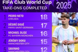 体育资讯7月11日讯 本届世俱杯仅剩巴黎vs切尔西的决赛,数据机构squakwa也统计了本届赛事成功过人情况,切尔西3将上榜。